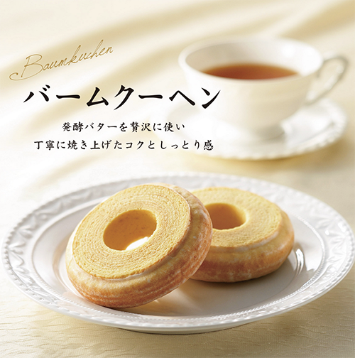 風味のよい発酵バターを贅沢に使った生地を、職人が丁寧に焼いています。外は香ばしく、中はしっとり。文明堂のバームクーヘンは、自分用にも贈りものにも人気の定番お菓子です。