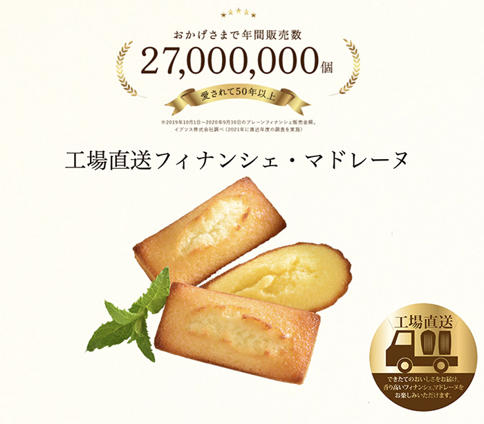 そんな、人気商品のフィナンシェとマドレーヌ、「オンラインショップ限定」ですが「フィナンシェ・マドレーヌの、焼きたてを工場から直送し、24時間以内にお届けする!」というサービスがあります。