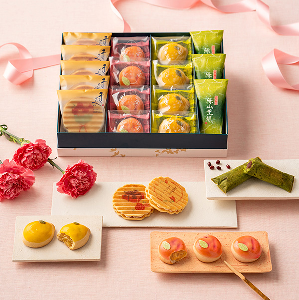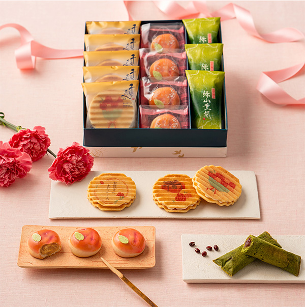 母の日の限定商品では、この千寿せんべいもカーネーション柄の特別なものとなり、より華やぎます。さらにお花をイメージした上生菓子や焼き菓子、おはぎなどが加ったラインナップが毎年人気を呼んでいます。母の日限定デザインのしも素敵です。