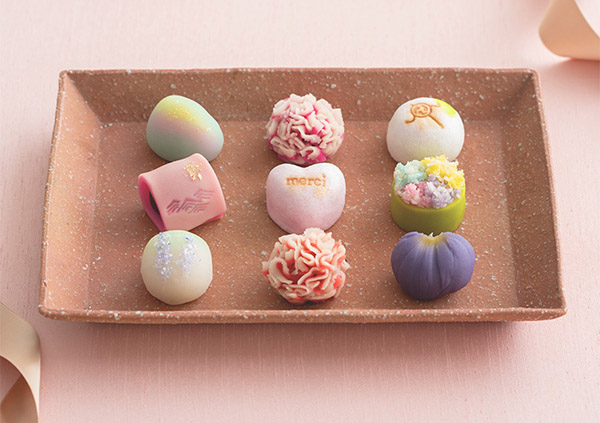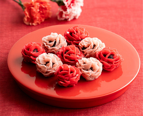 金とんで作ったカーネーションや花束、ハートや幼い日のおもちゃをイメージした上用饅頭など、それぞれが母の日のいろいろなイメージを描いていて、食べるのがもったいないほどの美しさです。