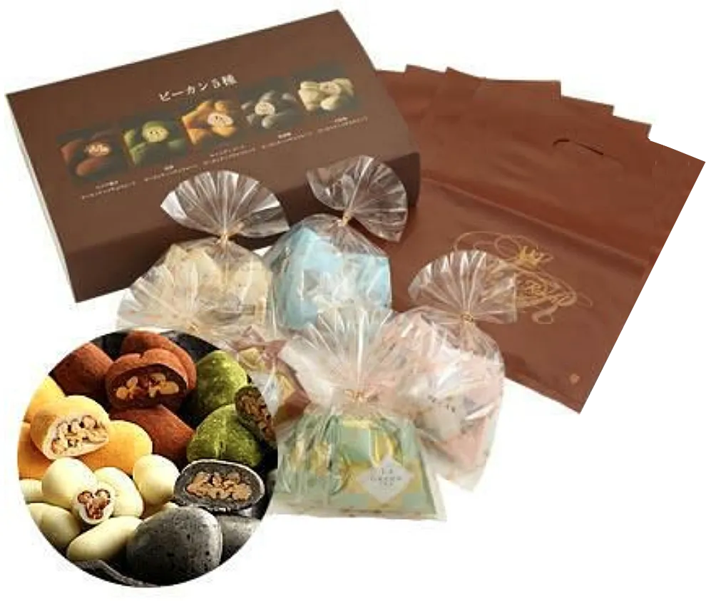 【Web限定】プチギフト ピーカン5種セットは、この5種類のピーカンナッツチョコレートが、18gずつの個包装で3袋、合計270gのセットとなります。