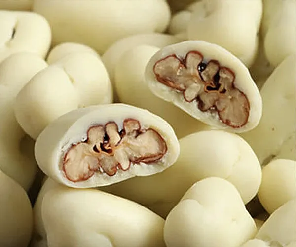 天然ピーカンナッツにキャンディコーティングをして、フランス産のカマルグ塩で塩味を付けたホワイトチョコレートで包んだ製品です。