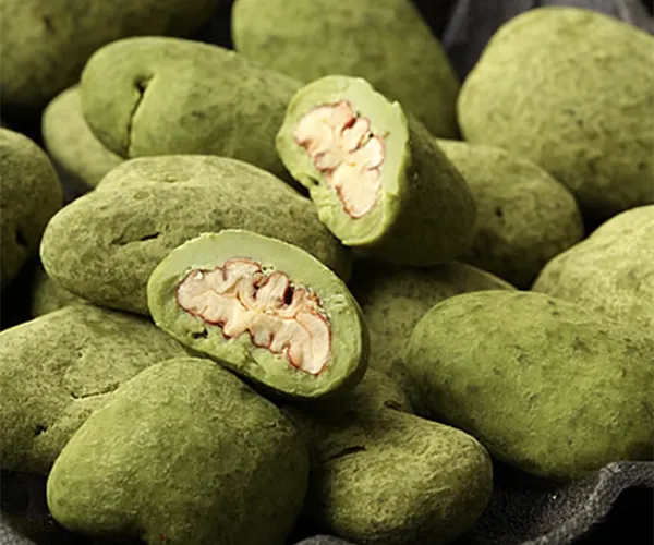 お茶の本場・京都宇治で作られ厳選された高級抹茶を粉状にして、贅沢に練り込んだ特製抹茶チョコレートを作り、ピーカンナッツをくるんで仕上げたものです。