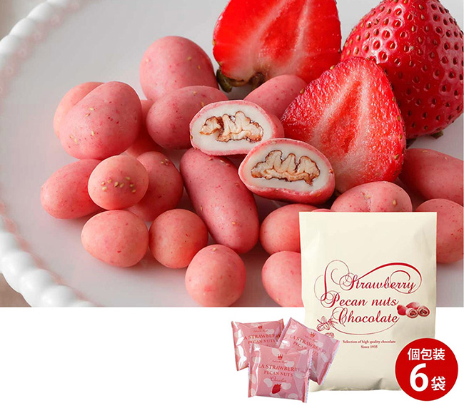 小粒のピーカンナッツを甘くキャンディーコーティングして、ホワイトチョコレートをかぶせ、さらにストロベリーチョコレートをコーティングしました。